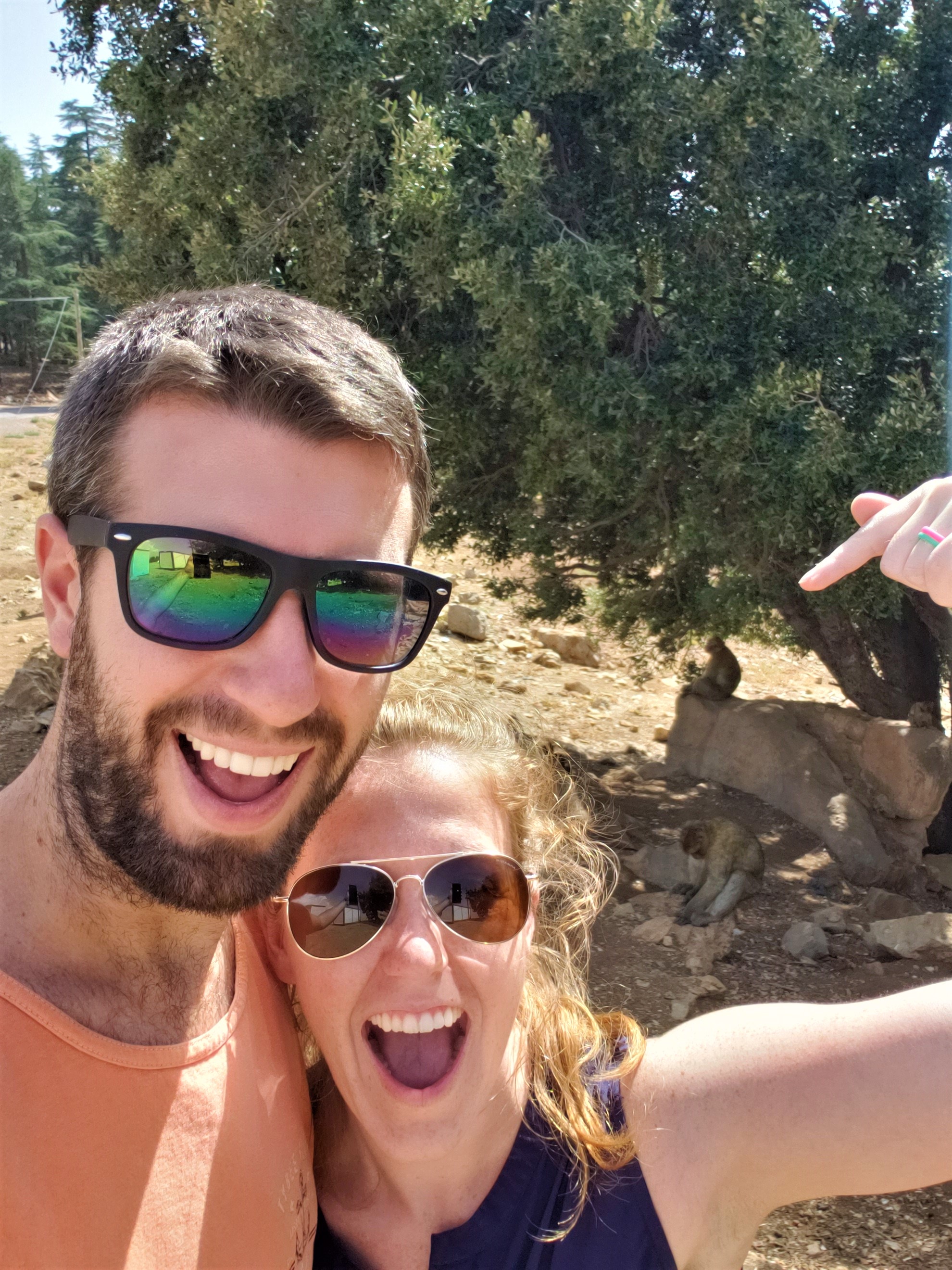 We traveled a few more hours, the scenery was beautiful in a desolate way and we continued to pass Berber villages. People walked from town to town along the highway, women covered from head to toe, I don’t know how they survive the heat. We learned quickly we don’t want to live in a desert. Around 1:30 we stopped for lunch. Sick of eating meat at boiling hot temperatures we split chicken skewers and a crappy pizza. The pizza was covered in olives but a welcome change. Dessert was more loquat and grapes! We piled back into the car and had about a 3-hour drive remaining. Our taxi driver was shaving about 10 minutes off every hour of the Google time estimate. We were torn if we were happy to get there sooner, or upset that we were narrowly avoiding head-on collisions every few minutes. About an hour out, we transitioned from desert into forested mountain area. We pulled over briefly to take pictures with monkeys that lived in the hills before finally descending into Fes.