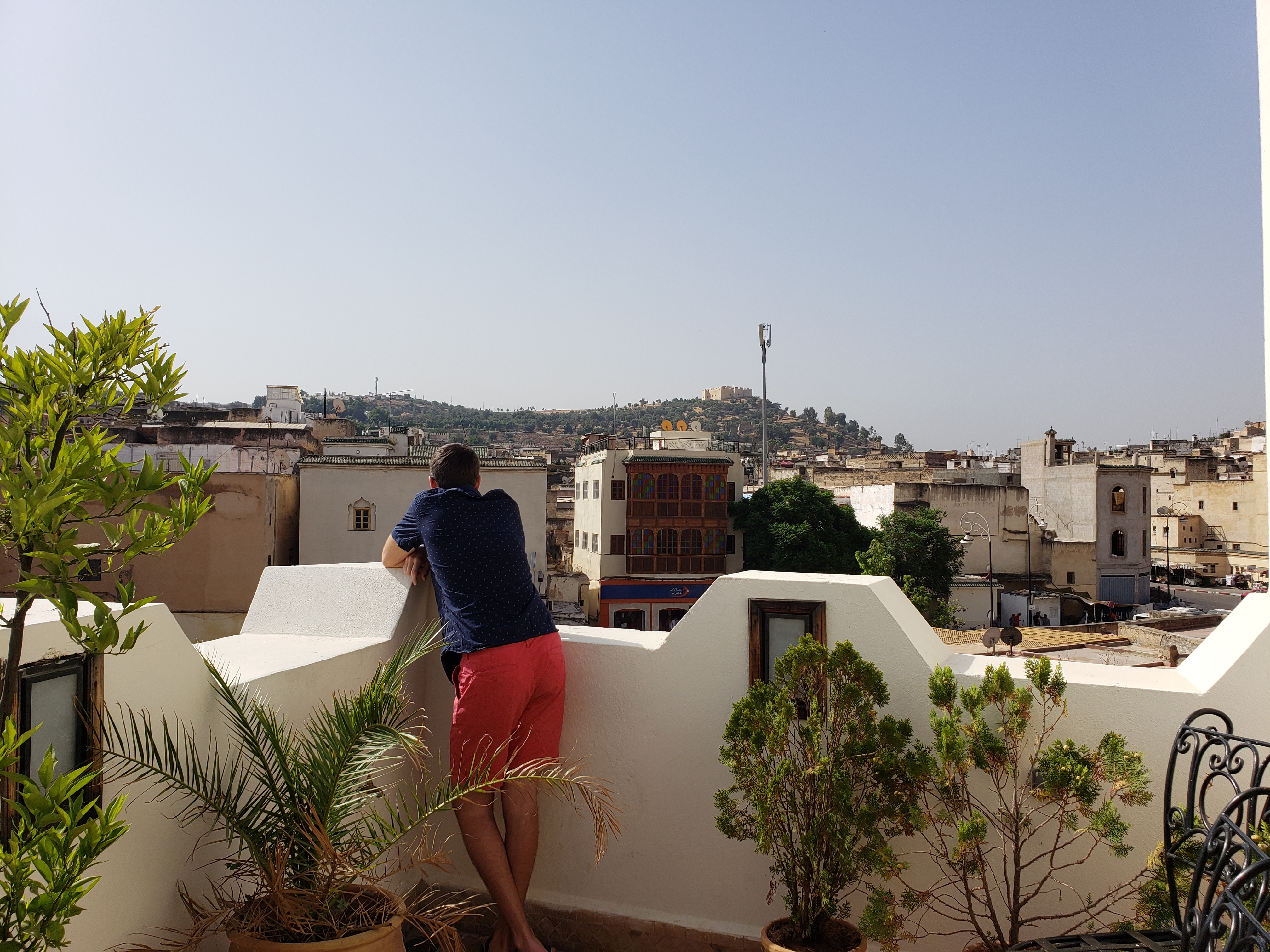 Our driver was kind of an ass and refused to drop us off near our hotel, only leaving us where the Chinese people wanted to be dropped. We began our 20-minute walk through the Medina hoping Google maps wouldn’t lose a signal. Along the way several skeevy looking young men aggressively offered directions and help. We’d read online that they will get you where you need to go, but then demand payment. We turned them down, which angered them and continued trusting Google. Ryan led us straight there no problem to our hotel Dar Essoaoude. Fatima, the woman running it, was very helpful and gave us cookies, tea and water as she described Fes. She told us it wasn’t a very safe city and to not stay out after dark and avoid everything outside of the historic district. We were led up to our room and were so excited to find we were staying in their nice suite on the top floor. We had working A/C and a huge room and bathroom. On the terrace were beautiful views of the city and a spot for lounging. We were too tired from the journey to venture into the city so we spent the night enjoying the cool A/C; it’s the little things!