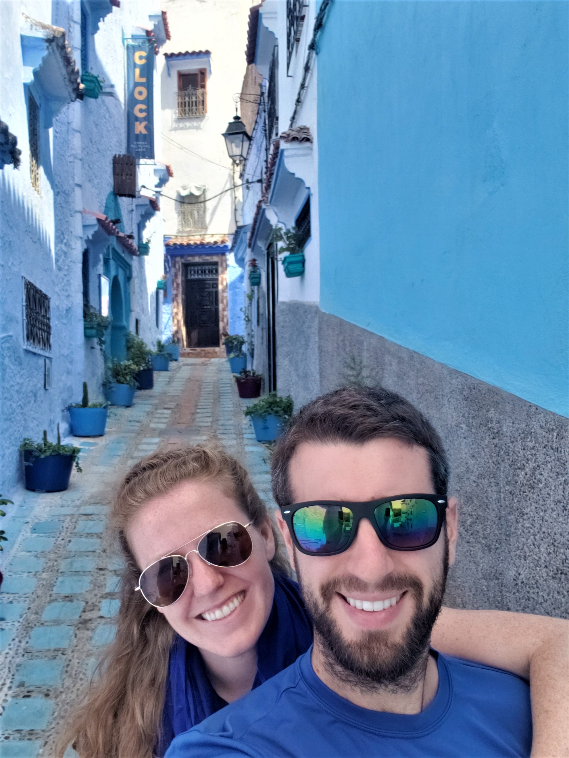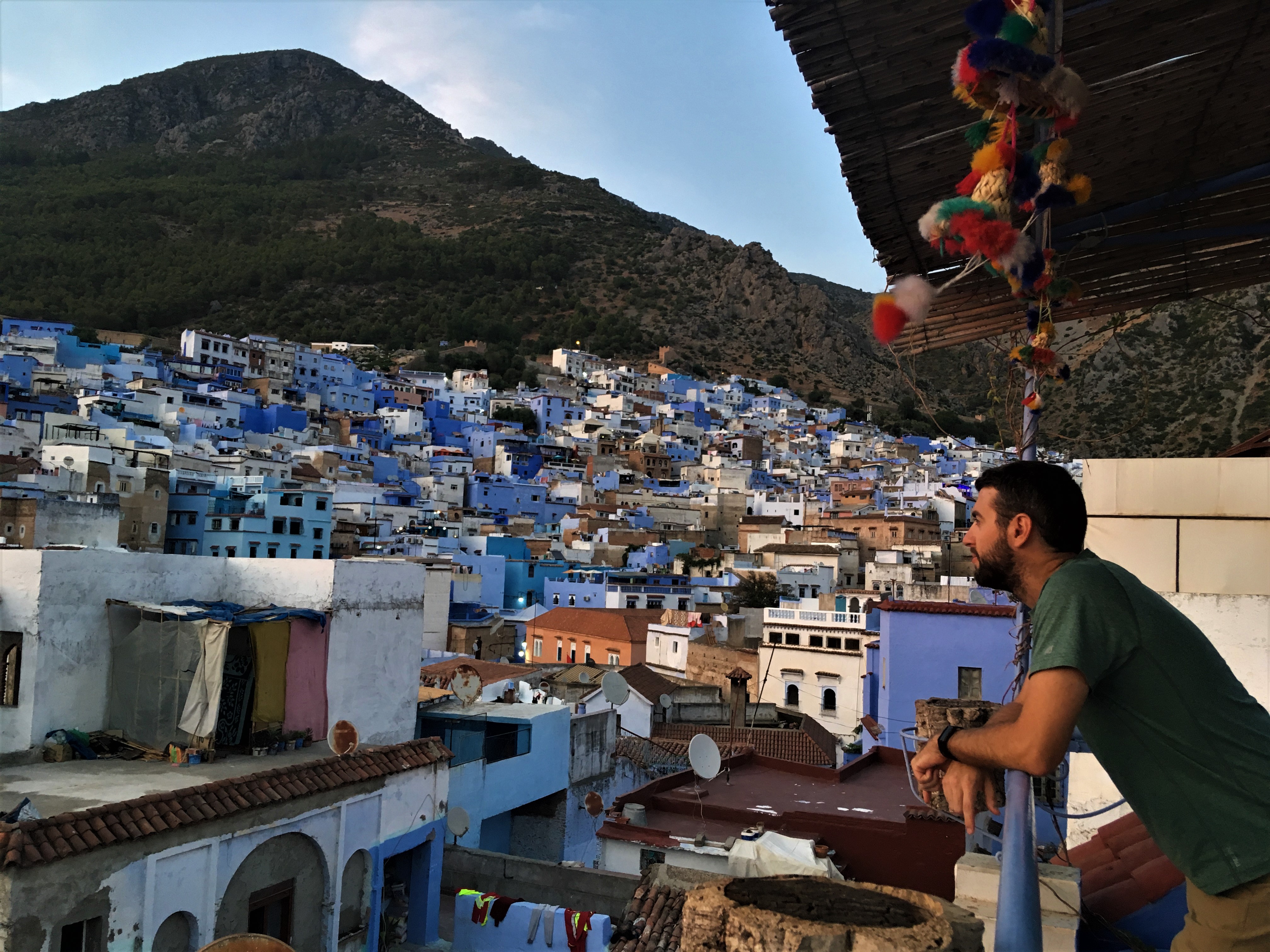 Unfortunately, the man next to us had the worst body odor we’ve ever encountered and the bus stopped 3 different times for breaks so the drive took us 4.5 hours. When we weren’t smelling Mr. Neverheardofdeoderant, we watched the countryside pass with olive tree fields into more luscious mountains and ate the rest of our seed-in grapes. We decided to walk to our AirBnB in the old medina (20 minutes) instead of taxi, not realizing the walk would all be uphill, but we needed the exercise. We arrived outside of one the seven gates into the old Medina called Bab EL Ain. A tall man named Ishmael our AirBnB host, guided us on a short walk through the Blue Pearl. Already we are enjoying this city more, it seemed much more laid back and we’ve only been harassed by 2 people. We have a whole apartment to ourselves for the next two nights. The setup of the house is really interesting. It’s narrow with a thin staircase and each floor is a different room. Starting at the bottom you have the front door, then bedroom, then kitchen and bathroom, then living room, and finally terrace. The terrace is the reason we chose the AirBnB. It looks out over the blue city with stunning views.