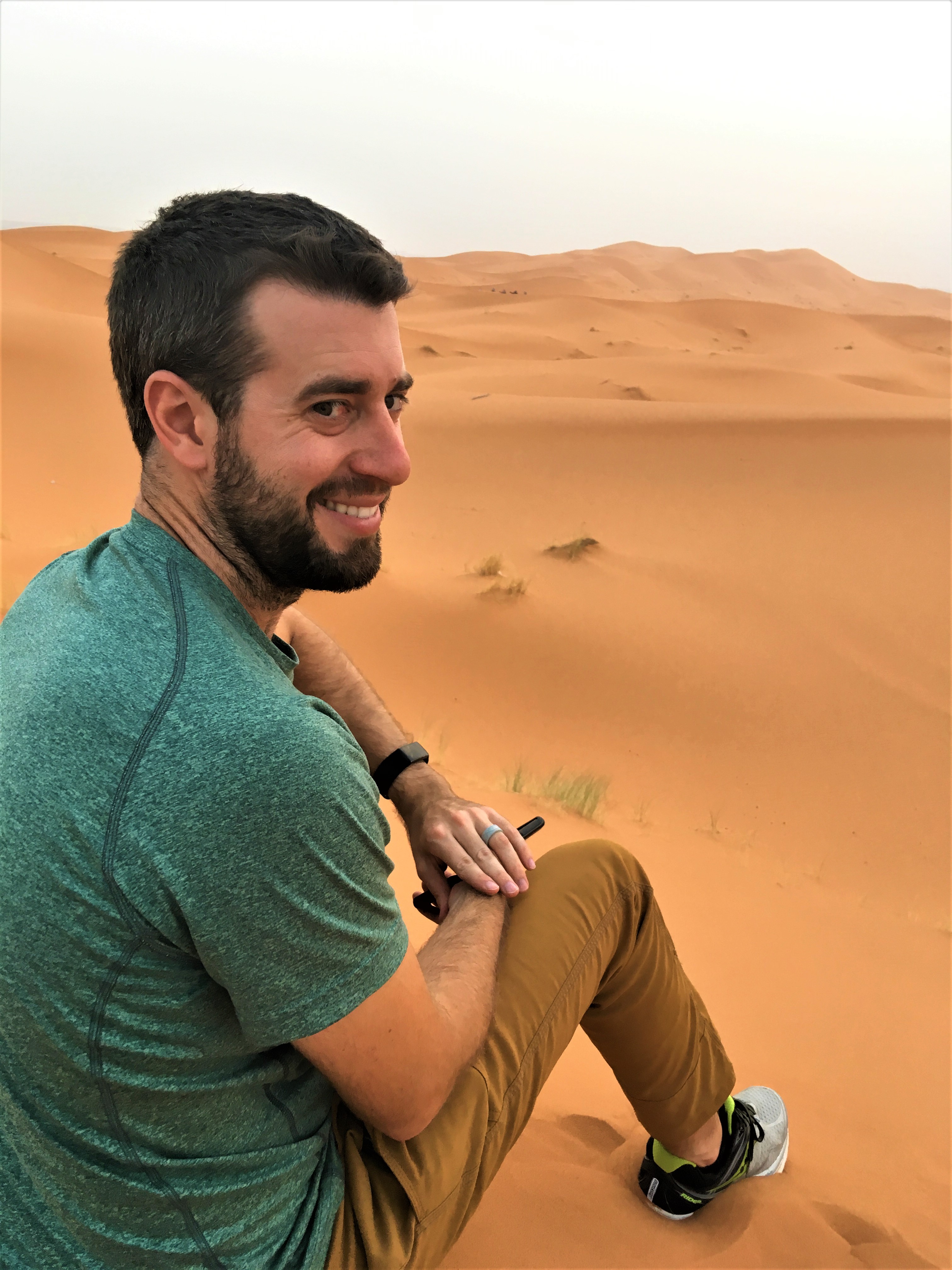 Todra is absolutely beautiful. A natural spring runs through steep, tall sandstone walls and people bring their herds of sheep there to graze. We spent a bit of time watching the sheep and cooling our feet in the cold water of the spring. Finally, it was lunch time and we went to a tourist trap lunch area where we sat on long sofas outside. Elizabeth ordered Galia which is like a frittata and comes in a tajine and Ryan got the grilled chicken. Then we were back in the car and had 3 hours to drive before reaching the Sahara.