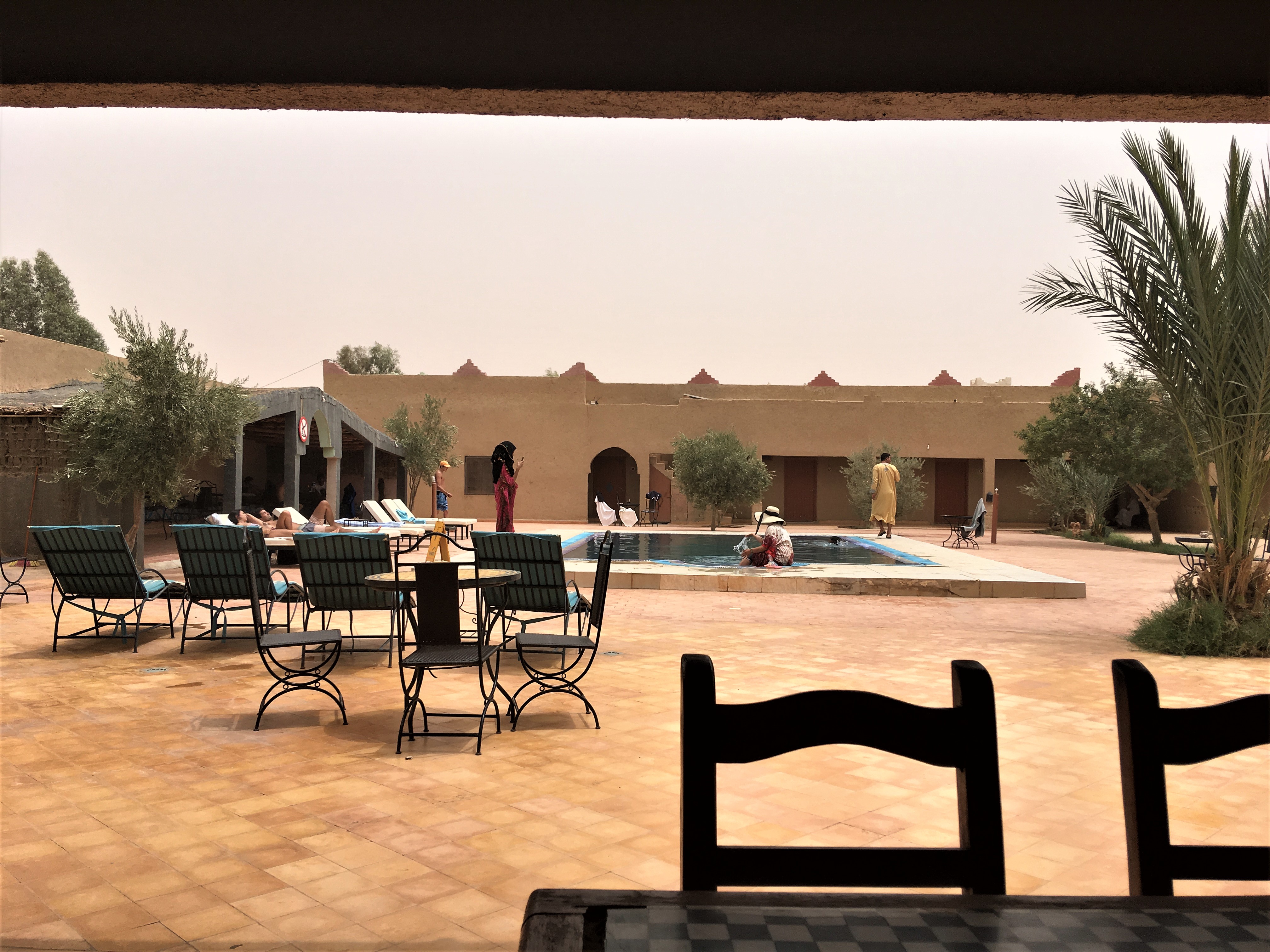 We stopped at a gas station about an hour out to refuel and get some melted and refrozen ice cream novelties. Stepping out of the van we felt scorching wind. Hotter than either of us had ever experienced. It might not be humid like it is in Houston, but the locals wear long pants and shirts! Eventually, we rolled into the desert and found a herd of camels. Apparently, we were on a different tour – we knew something had been off the whole time – so we dropped off our “friends” and headed with the driver another 15 minutes to the town of Mezourga, where we’d sleep in the hotel the following night. We were running late and had about 10 minutes to pack a small bag and leave the rest of our belongings with the hotel to catch up with the group headed towards the camels.