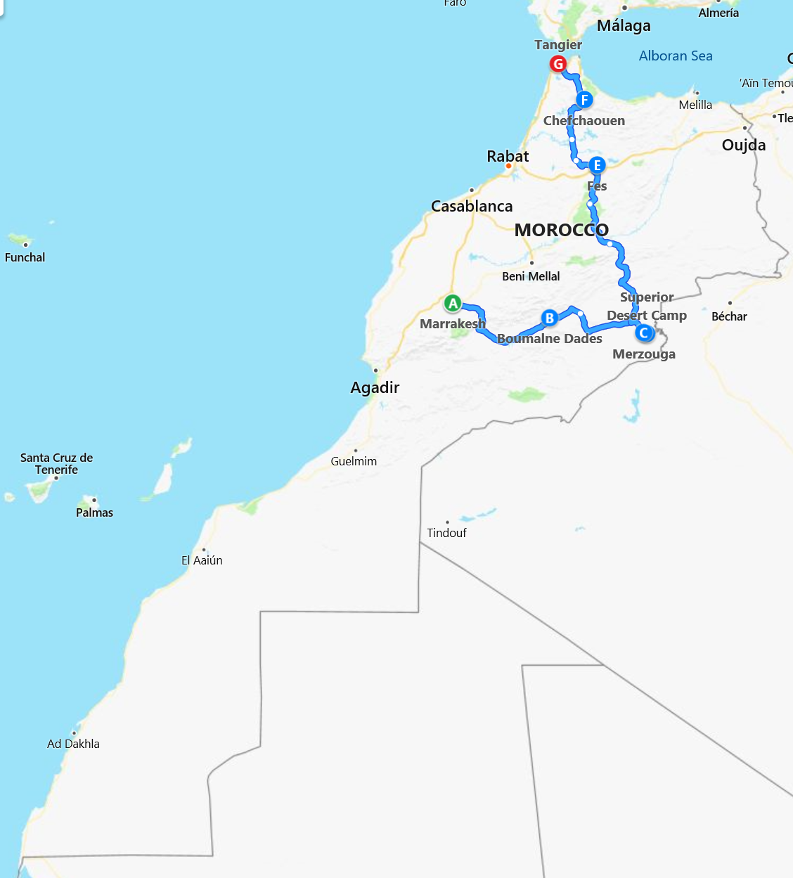 According to our scarce itinerary from the tour company we would be picked up from our hotel around 7:30 to be transported to the rest of group and begin our adventure into the Sahara. A man arrived at 7:05 so we scarfed down our bread and crepes and followed him out of the medina. Along the way, we picked up another passenger hailing from Poland and joined two French girls on the bus. Thinking we were only 5 riding in the van we were pretty excited for our space available in the 18-passenger van. But, of course, this van was just taking us to another van, where we were the last people on, and stuck in the back of the bus. We booked a 5-day tour that would take us from Marrakesh over the high Atlas Mountains into Boumaine Dades Gorge, roughly a 5-hour drive. Then we’d travel an additional 5 hours to the Sahara. We’d spend one night in a desert camp after riding camels and one night in a hotel in Mezourga before driving 7 hours to Fes. We knew it’d be a lot of driving but it’s not easy to access the Sahara from Morocco.