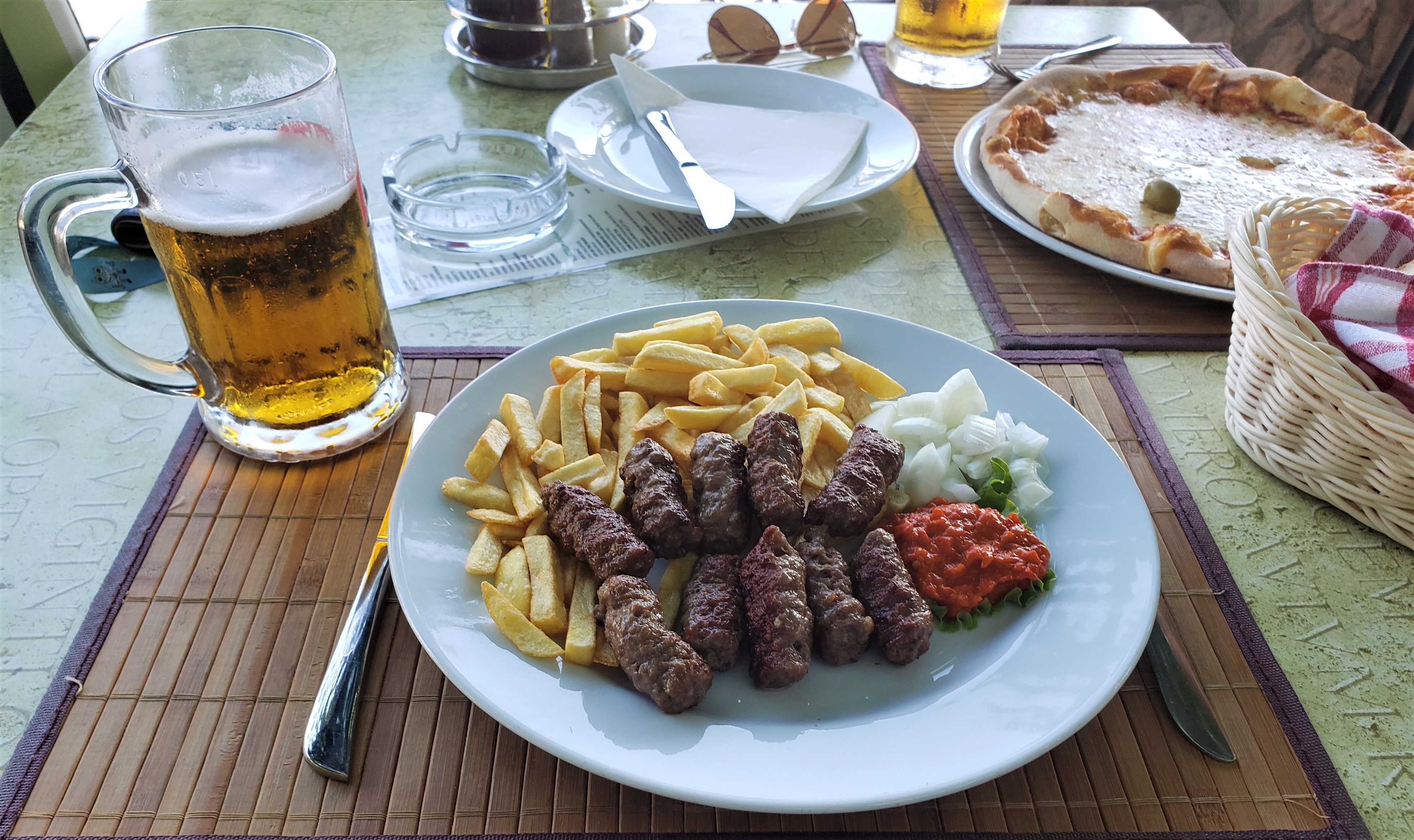 Our driver dropped us off at the station only to find out that the trains here were also cancelled due to the strike, but a helpful employee let us know a bus would be coming in about 2 hours. So, we had some time to kill and, being in France, no restaurants opened until 6. We walked into town and found a dirty bar to burn 30 minutes until we could get some food. We walked in and immediately got the attention of everyone in the joint. It’s the type of bar that has darts and a big bird cage, but no bird. We drank some French beers and the boys got cigarillos for later. Next door, a small pizza restaurant opened at 6 and we shared three pies. They weren’t the best, but we were so hungry and they were so friendly, it all tasted amazing. They even gave us a free pizza when Ryan spilled a glass of water all over one. Don’t worry we didn’t let the wet pizza go to waste.