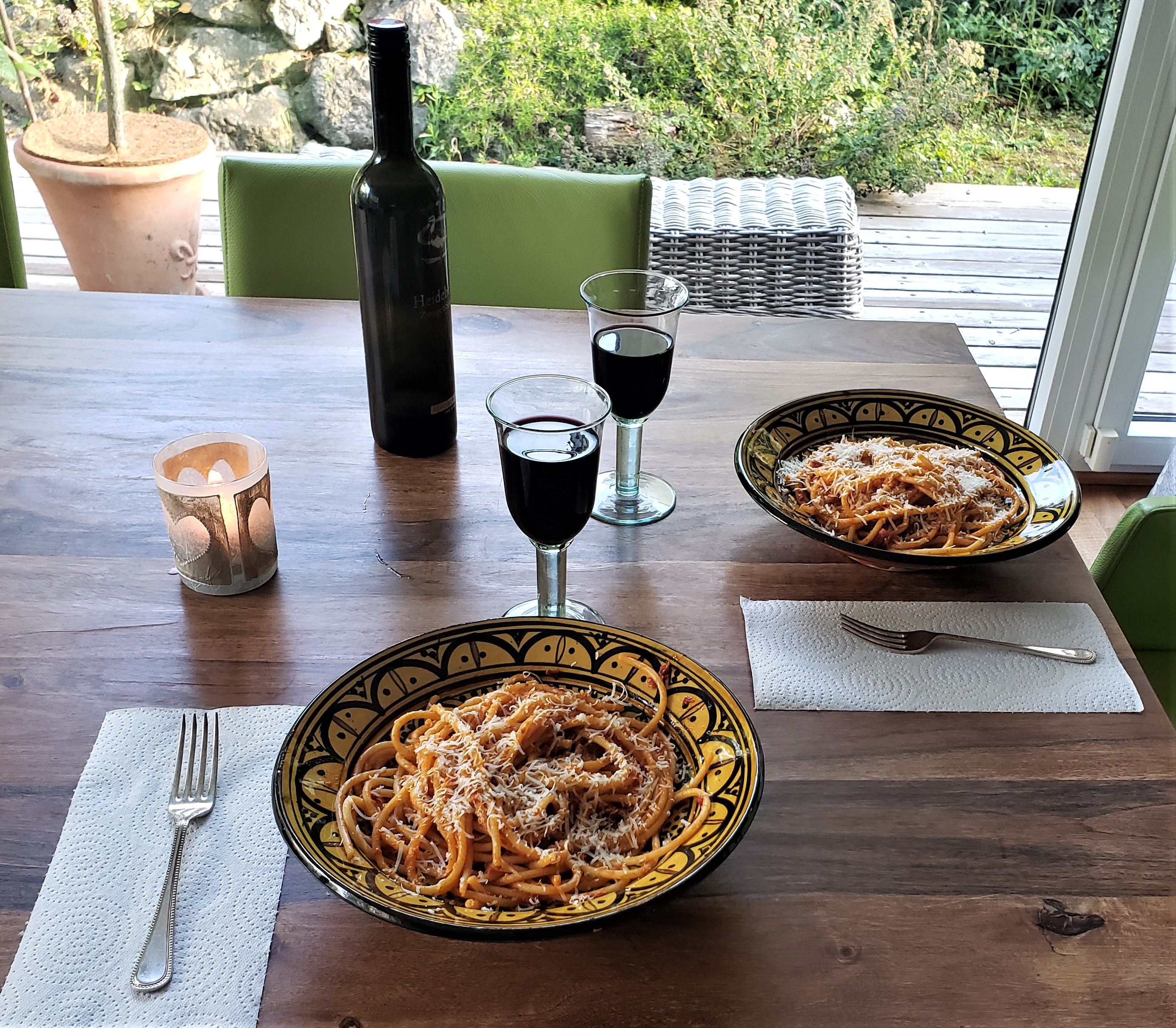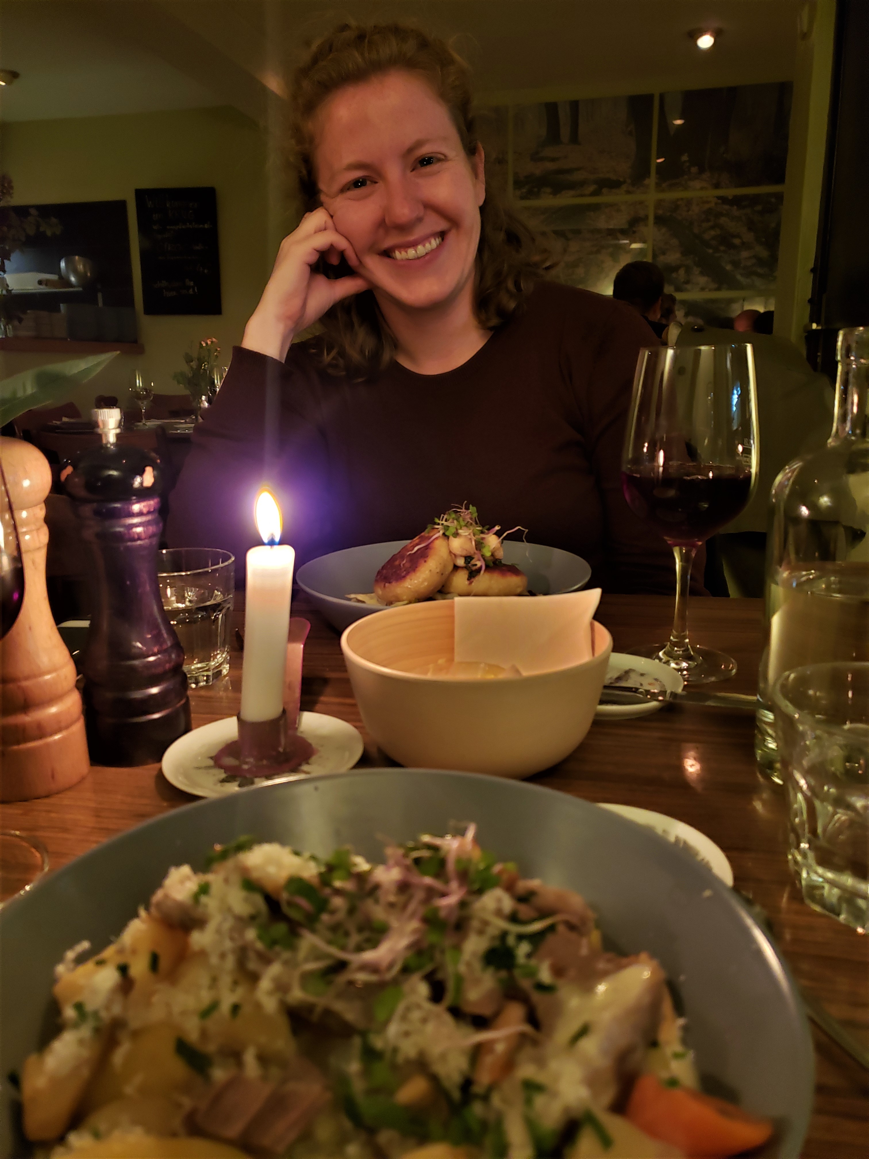 French restaurants tend to shut down from about 4-7 pm, right as we were getting hungry. Fortunately, we found an open wine bar on our way out of town. Randy bought a bottle of wine and the “winetenders” put it in an obnoxiously large decanter for us. We sipped wine and ate more cheese and bread with smoked beef, probably the best cheese we’d ever had.