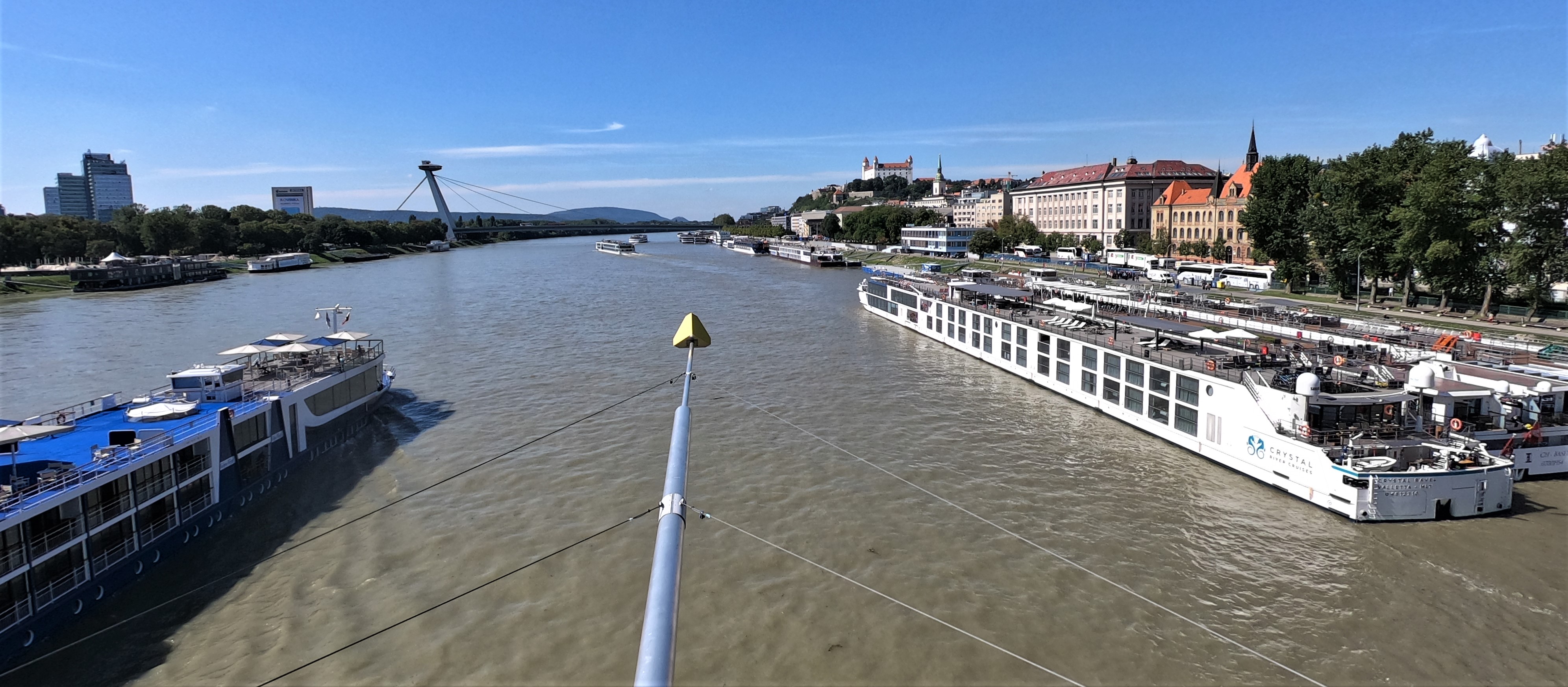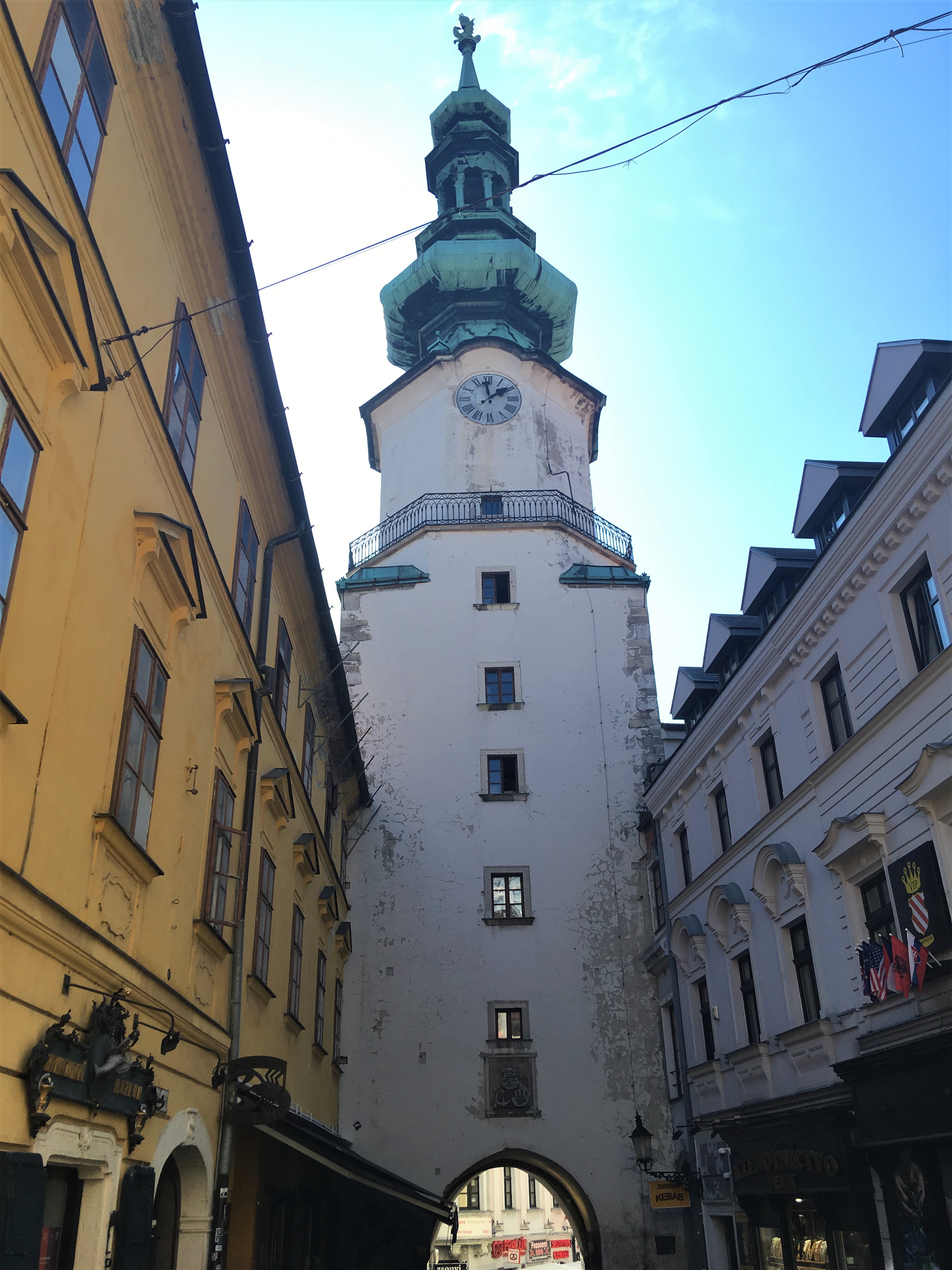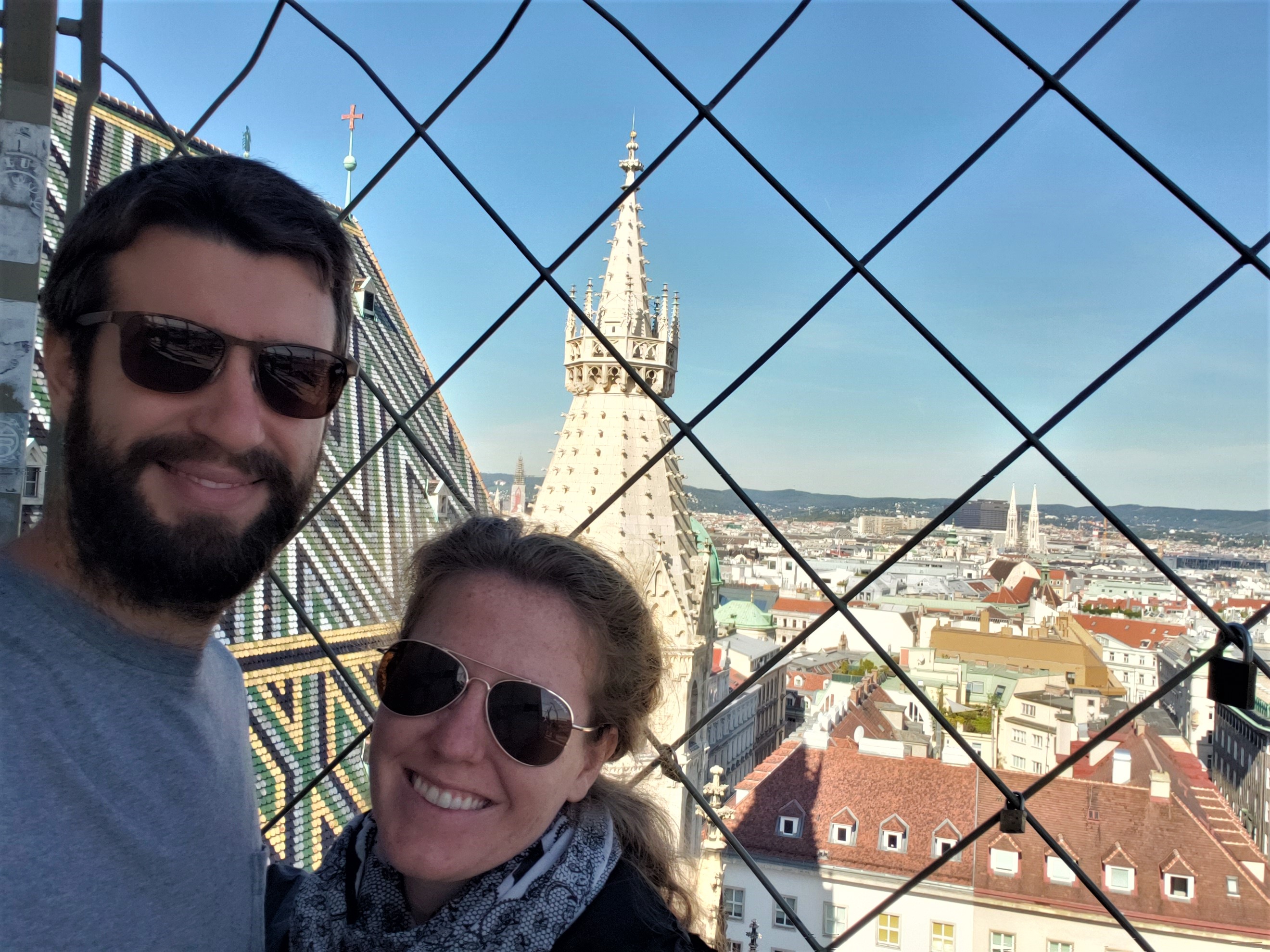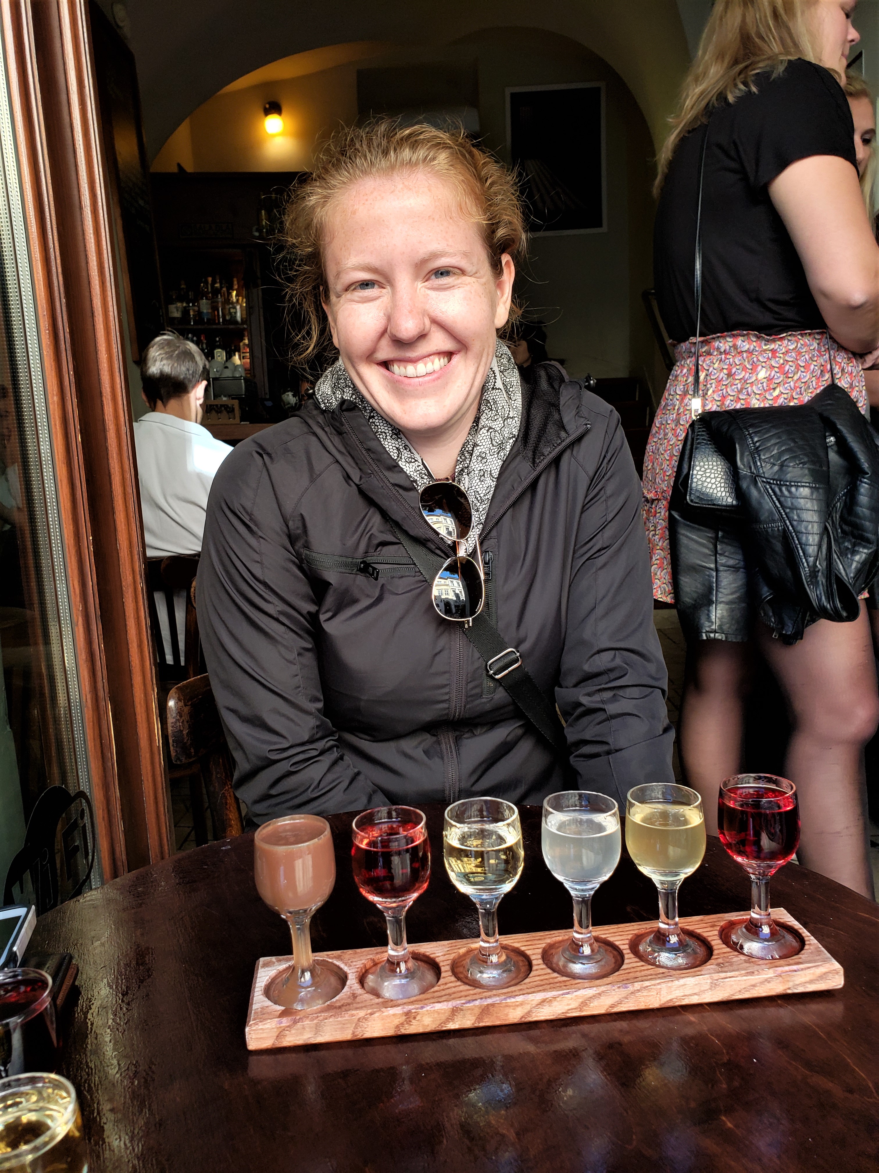They provide an audio device then you can roam around watching different movies about wine all over the world. There’s also a really cool interactive area where you smell things and try to guess what it is. After learning too much about wine, we made our way to the top floor for our complimentary glass of wine and great views of the city, entering the neck of the decanter. We each chose a wine and headed out to look over the river and the city in the distance.