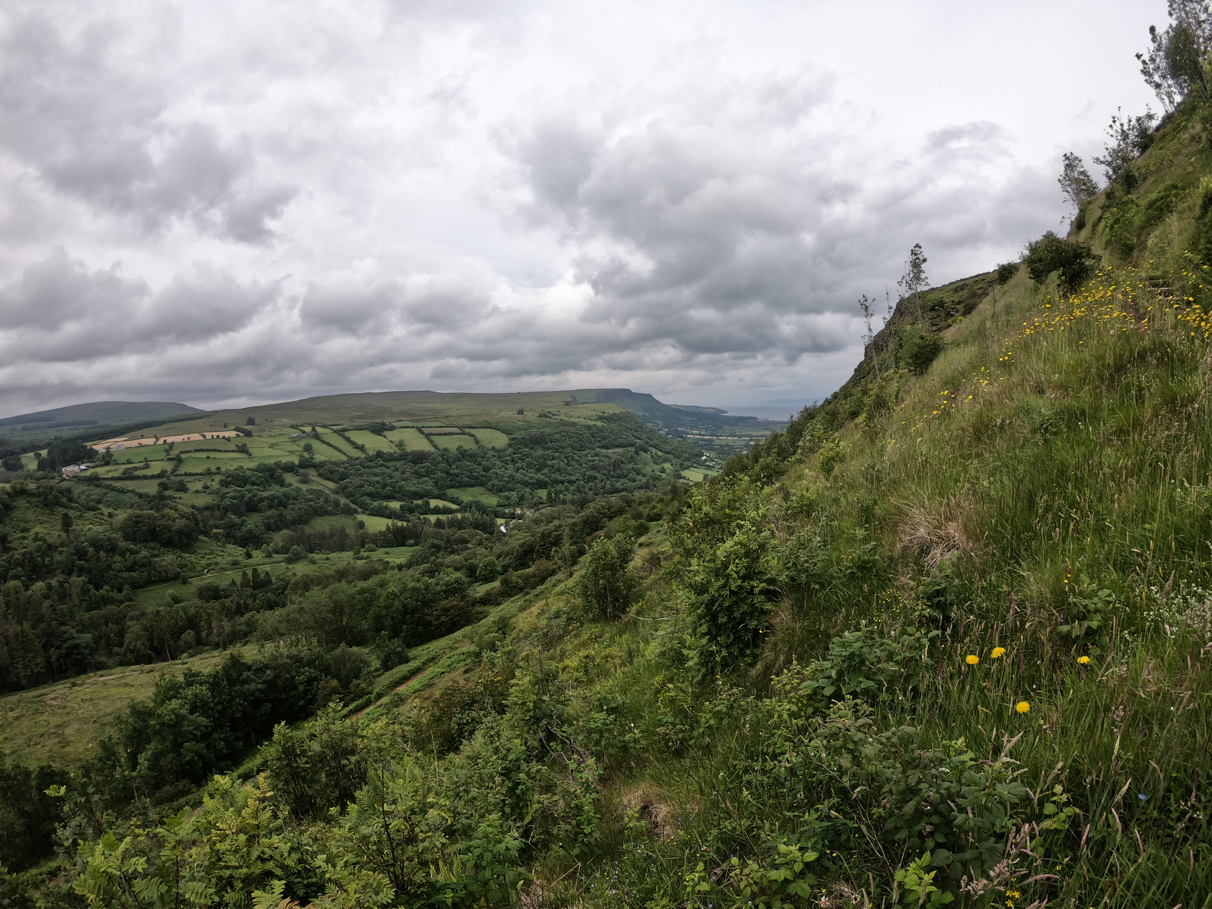 From our open window every morning and every night we feel the cool breeze of 50-degree weather and hear baas and moos of the livestock – it’s such a refreshing way to begin and end the day! We went down for breakfast and met Mary’s eldest daughter Sara. Sara had been on a cruise through the Mediterranean, home from a teaching break from Qatar, but came back early for her grandmother. We had a delicious cooked breakfast with thick bacon and pancakes learning all about the middle-east from Sara. They gave us a long list of potential hiking areas to chose from. They live just south of the Glens of Antrim. This area is composed of nine glens – a glen being a lush valley – that stretch to the shores. We decided to visit Glenariff Forest Park. Glenariff – the Queen of the Glens – is a beautiful forested area with long trails and waterfalls. We paid the 5 pounds and ventured into the woods. We hiked the long scenic trail first that took us up 325 m of elevation with great views of the forest, wildflowers, and the coast.