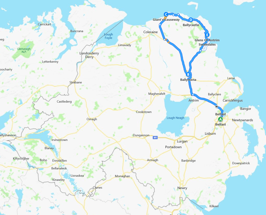 We agreed and trained from Dublin to Belfast on a 2.5-hour journey that weaved along the western coast through green countryside. A cup of tea, and some time to catch up on rest and writing, brought us into Belfast in the midafternoon. We then hopped on the short rail trip to Sydenham. While on route the bathroom door wouldn’t close; this didn’t stop one man from using it anyway. He asked the man sitting across from it if he was alright with the endeavor, but the train conductor was not as lenient. After a brief, but intense, verbal altercation where the man berated and challenged the train conductor, he stormed back to his seat. His wife came back, ostensibly to apologize for his behavior and explain how their daughter was in the hospital, but it did little to assuage the conductor. Oof, welcome to the UK. From there we took a courtesy shuttle to the Belfast City Airport to collect our rental car then we hoped on the roads towards Corkey where Elizabeth’s cousin (technically second cousin twice removed, if our genealogy math is correct), Mary Connolly, was letting us stay for a few nights. She lives in an absolutely gorgeous and quaint house nestled deep in the rolling hills of County Antrim. She couldn’t be a more gracious host and had a delicious Thanksgiving-style feast waiting for us when we arrived consisting of stuffed chicken, potatoes, carrots and asparagus, with soda bread – all smothered in a delicious brown gravy. We chatted with Mary as she educated us on Irish history, the troubles and Ireland culture. Bellies full and exhausted from carousing for a week straight, we decided to call it a relatively early night; we were asleep by midnight.